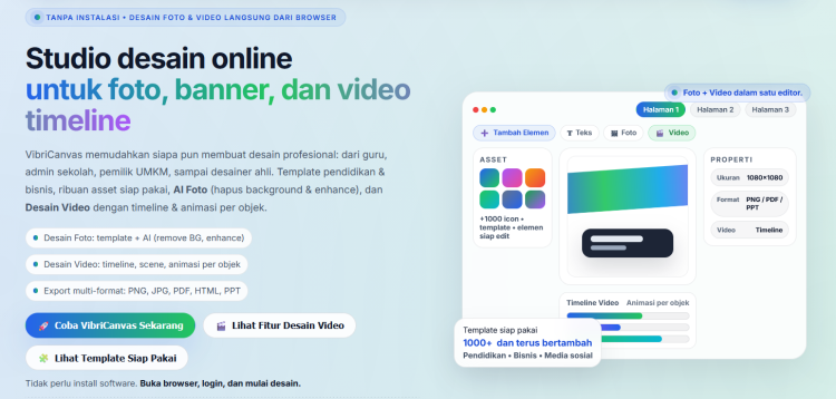 Editor VibriCanvas dibuat supaya kamu fokus ke ide, bukan ribet setting. Cocok untuk sosial media, presentasi, materi promosi, dan kebutuhan visual lain.